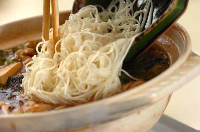 ブリに火が通ったら出来上がり。鍋の最後に素麺を加え、温めていただく。