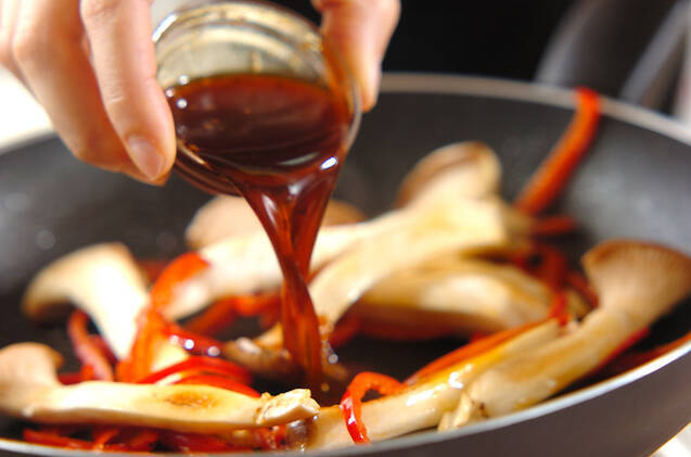 フライパンにバターを熱し、エリンギと赤ピーマンを炒め、しんなりしたら焼肉のタレを加える。