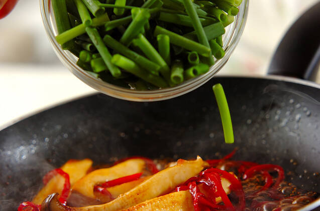 汁気が少なくなるまで炒め、細ネギを加えて軽く炒め合わせる。塩コショウで味を調え、器に盛る。