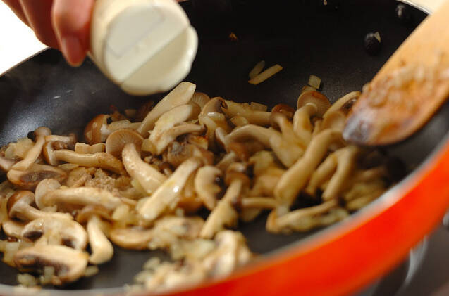 フライパンに半量のオリーブ油を熱し、玉ネギ、マッシュルーム、シメジを加え、しんなりするまで炒めて塩コショウをする。お皿に移す。
