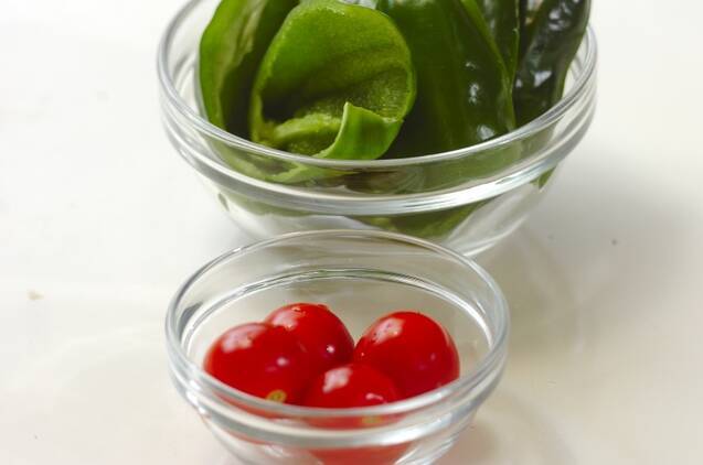 ピーマンは縦半分に切って種とヘタを取り除く。プチトマトはヘタを取る。バゲットはトースターでカリッと焼いて取り出す。ニンニクは包丁の背で潰す。