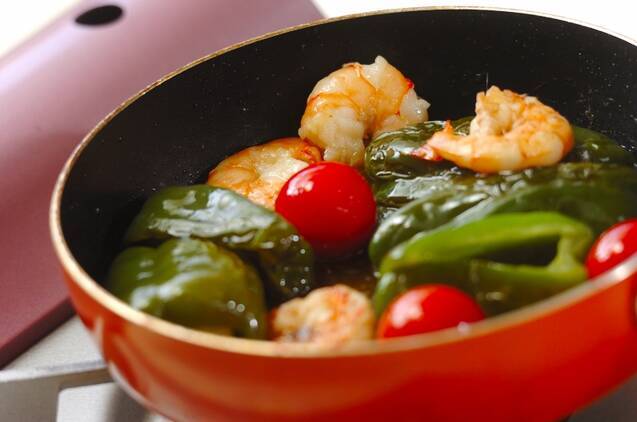 ピーマンがクタクタになったらエビ、プチトマト、アンチョビを入れ、エビに火が通ったら塩で味を調える。