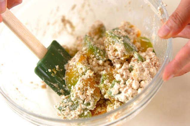 煎ったクルミをすり鉢ですり、またはハンドプロセッサーで細かくし、他の<和え衣>の材料と混ぜ合わせる。カボチャを加えて和え、器に盛る。