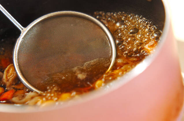 鍋に<合わせだし>の材料を強火で熱し、煮たったらグリンピース以外の具を加える。再び煮たったらアクを取り、落とし蓋をして中火にする。