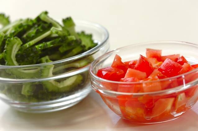 ゴーヤはスプーンで種とワタを取り除き、幅5mmに切る。トマトはヘタを取り、1cm角に切る。<水溶き片栗>の材料を混ぜ合わせる。