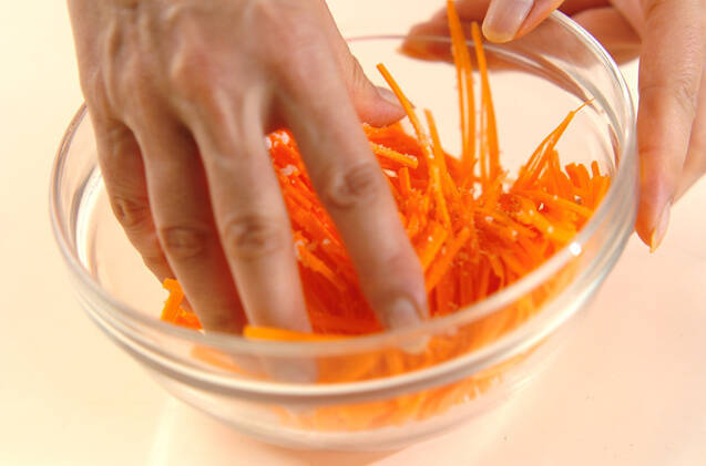 ニンジンは皮をむいて長さ5~6cmのせん切りにし、塩を加えて軽くもみ、5分置く。