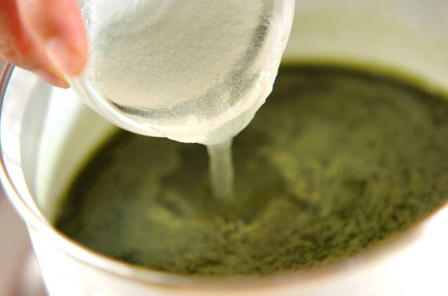 小鍋に抹茶と砂糖を入れ、よくすり混ぜる。水200mlを加えて火にかけ、砂糖を溶かす。火を止め、ふやかしたゼラチンを加え、余熱で溶かす。