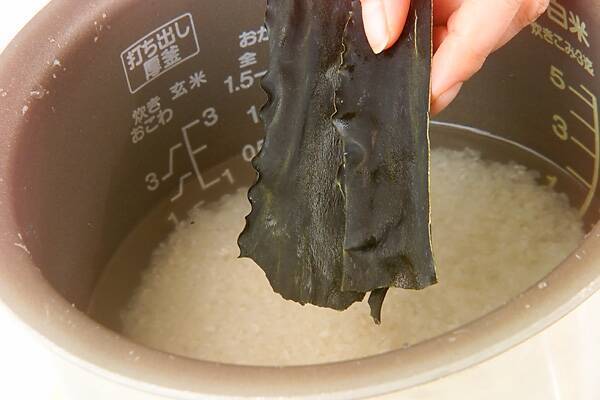 米は洗ってザルにあげ、30分くらいおく。昆布と一緒にすし飯分量の水加減で炊く。