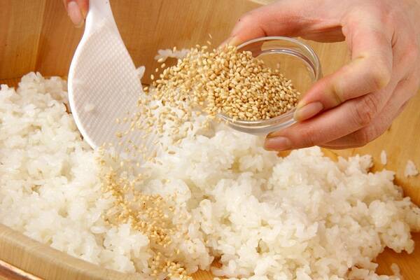 すし飯が人肌位に冷めれば白ゴマ大1.5を混ぜ合わせ、器に盛る。