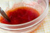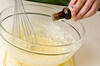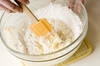 <生地>を作る。バターを泡立て器でクリーム状に混ぜ合わせ、砂糖、牛乳、卵を加えてよく混ぜ合わせ、バニラエッセンス少々を加えあわせる。