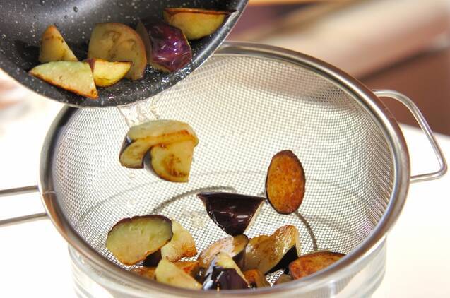 フライパンに水気をきったナスを入れ、サラダ油大さじ4を加えて中火でしんなりするまで炒め、ザルに上げて油をきる。