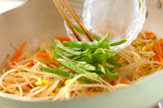 フライパンにサラダ油を強火で熱し、豆モヤシ、ニンジンを加えてしっかり炒め合わせ、さらにピーマンを加えて炒め合わせる。