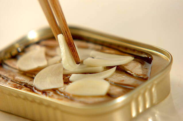 オイルサーディンの蓋を開け、薄切りにしたニンニクをのせる。