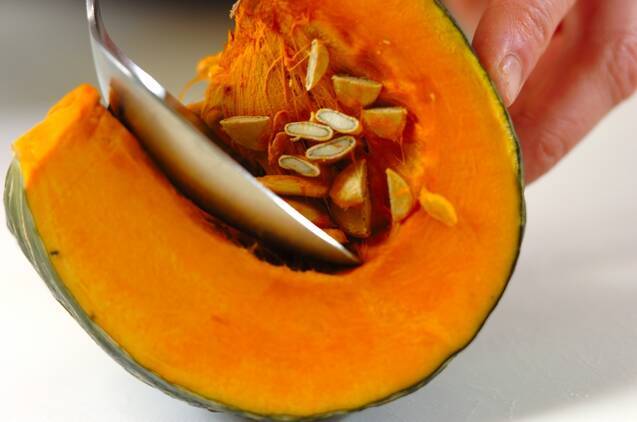 カボチャはワタを取り、大きめのひとくち大に切る。