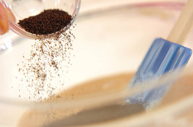 振るった粉類を加え、泡立て器からゴムベラに変えて混ぜ、焦がしバターを茶こしなどを通しながら加える。滑らかな生地になるまで混ぜ、紅茶葉、バニラオイルを加える。