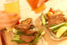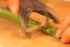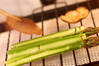 グリーンアスパラは軸の堅い部分を少し切り落とし、袴ごとピーラー等で所々皮をむく。生シイタケは軸を切り落とし、堅く絞った布巾で汚れを拭きとる。