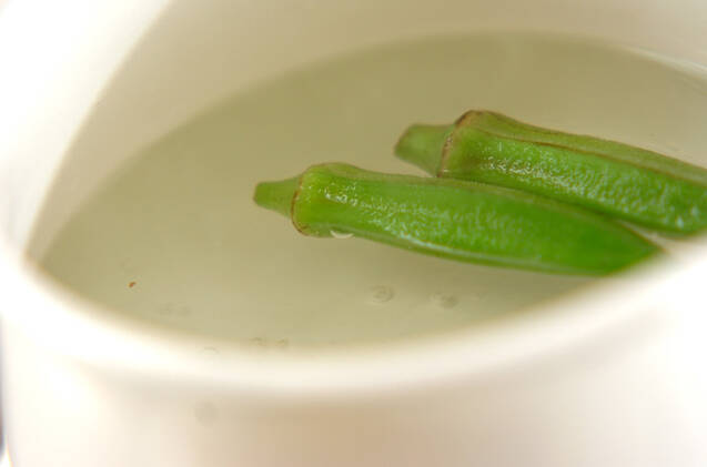 熱湯にオクラを塩ごと加え、色が鮮やかになったら水に取る。粗熱が取れたら水気をきり、ヘタを切り落として幅5mmの輪切りにする。