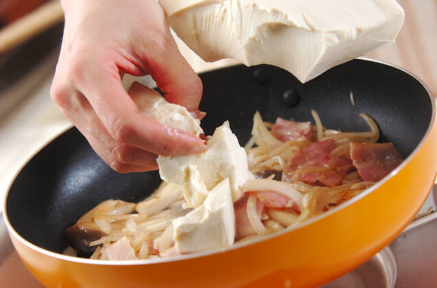 絹ごし豆腐を大きく手でくずしながら加え、強火にしてサッと炒め、塩コショウで味を調え、器に盛る。