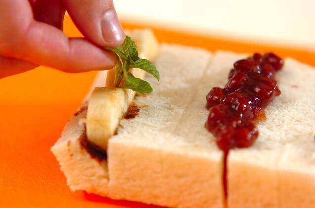 5番目の切り込みにチョコシロップをぬり、バナナをはさみ、ミントの葉をのせる。