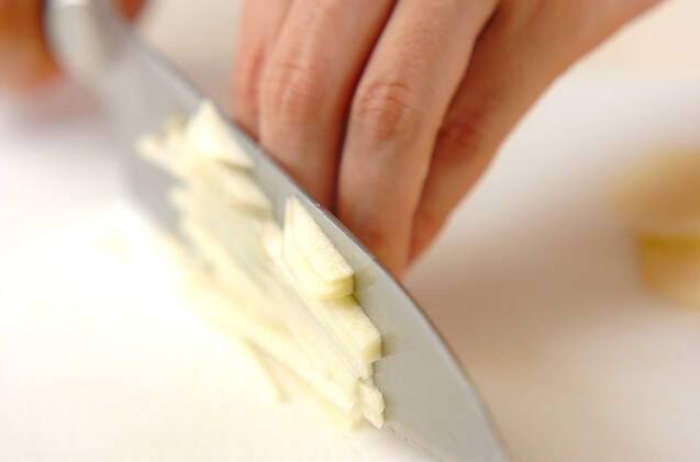 リンゴは4つのくし切りにしてから皮をむき、芯を取ってキュウリに合わせて細切りにする。