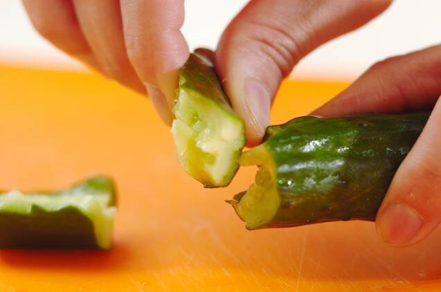 キュウリはすりこ木で軽くたたき、両端を切り落として手でひとくち大に分ける。ミョウガは縦半分に切る。