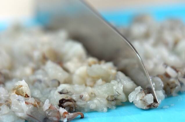 エビは殻をむいて背ワタを取る。塩水で軽くもんでから水洗いし、水気を拭いて粗みじんに切る。<水溶き片栗>の材料を合わせる。