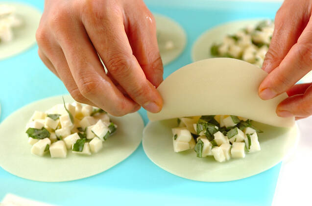 餃子の皮の中央にモッツァレラチーズをのせ、皮のフチに水をグルッと薄くぬり、もう1枚の皮を重ねてフチを手でしっかりとおさえる。
