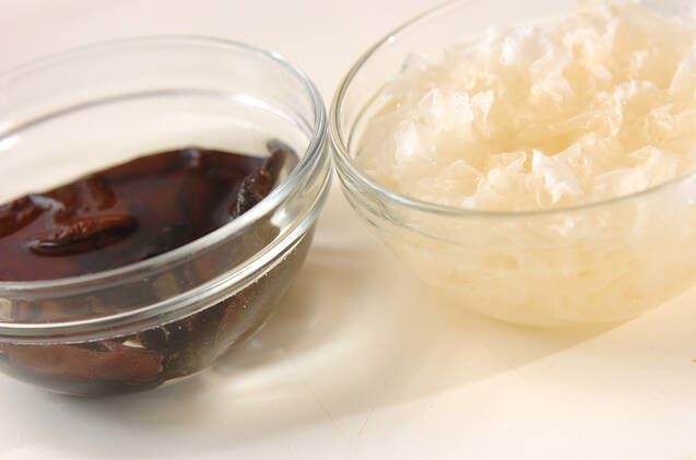 キクラゲ、白キクラゲは水で柔らかくもどし、固い部分を取り除いて食べやすい大きさに切る。