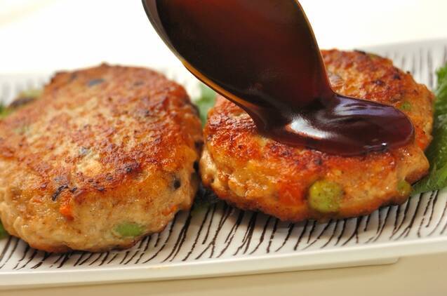 フライパンをキッチンペーパー等でサッと拭いて<タレ>を加え、強火にする。<水溶き片栗>を加え、トロミがついたら(2)の<つくね>にかけ、白髪ネギをのせる。