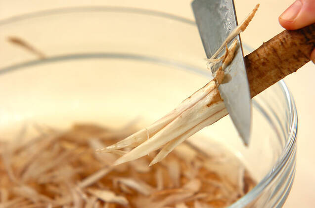 ゴボウはタワシで水洗いし、ささがきにして水に放ち、水気をきる。