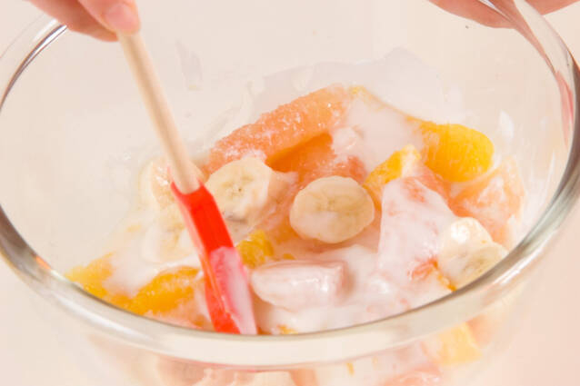 フルーツと<ドレッシング>を混ぜ合わせ、器に盛り、あればミントの葉を添える。