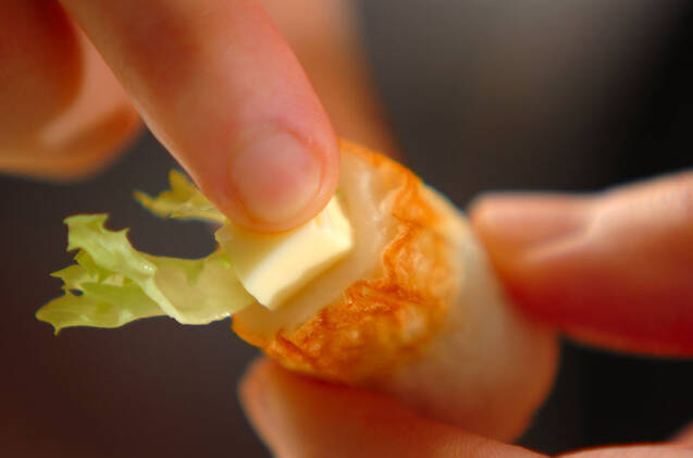 リーフレタスを適当にちぎり、ちくわに詰め、さらに切ったプロセスチーズをちくわに詰める。
