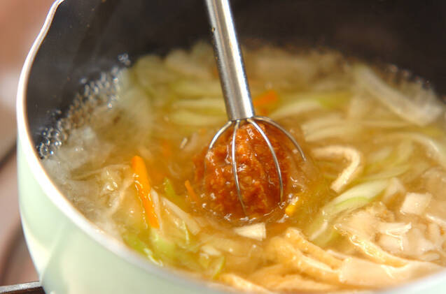 鍋にだし汁、切干し大根を入れて中火にかけ、煮たてば火を弱めて4~5分煮、ニンジン、白ネギ、油揚げを加える。再び煮たったら、田舎みそを溶き入れ、最後に刻みネギを加えて火を止め、器に注ぎ分ける。