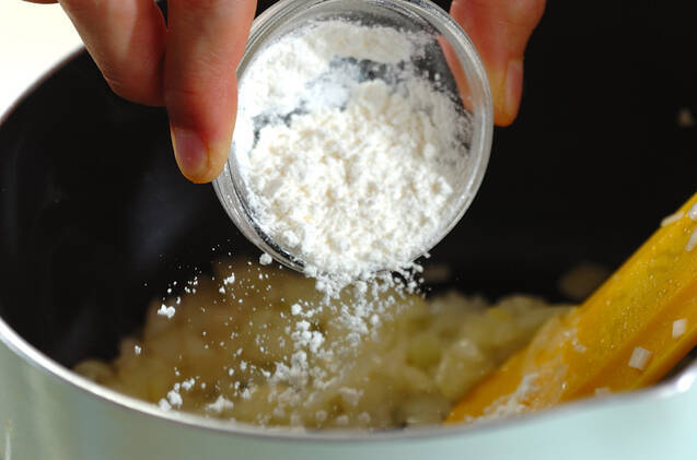 鍋にバターを入れて弱めの中火にかけ、バターが溶けたら白ネギ、玉ネギが透き通る位まで炒める。さらに小麦粉を加え、粉っぽさがなくなるまで炒め合わせる。