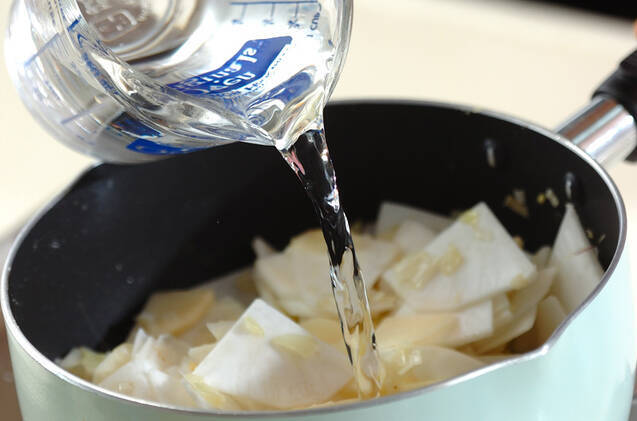 (1)にジャガイモ、カブ、水を加えて蓋をし、煮たったら火を弱め、具が柔らかくなるまで10~15分煮る。