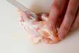 鶏手羽元は水洗いして水気を拭き取り、骨に添って切り込みを入れ、<下味>をからめて20分置く。