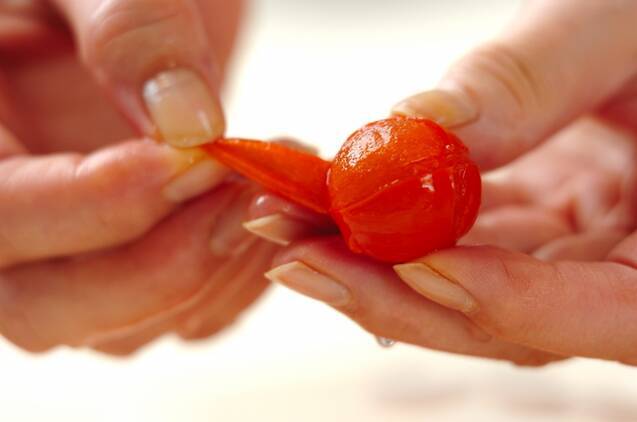 プチトマトはヘタを取る。下に浅く包丁で十文字に切り込みを入れ、沸騰した湯に入れて6~8秒したら水に取り、薄皮をむく。