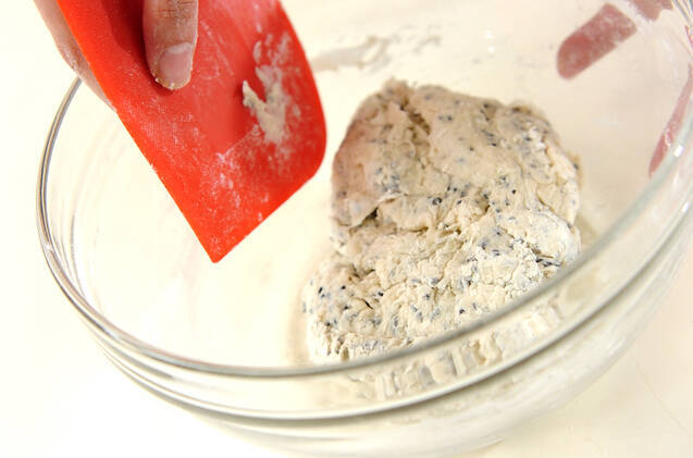 カードを使って混ぜ、生地がまとまってきたら分量外の打ち粉をした台に移し、こねる。