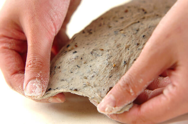 生地がまとまってきたら、台にたたきつけるようにしながらこね、生地を引っ張ってみても切れず薄くのびるようになるまで繰り返す。