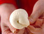 切り口を内に巻き込むように丸め、下側の閉じ目をしっかりつまんで丸型に形を整える。キャンバス地などにのせて固く絞ったぬれ布巾を掛け休ませます。(ベンチタイム15分)