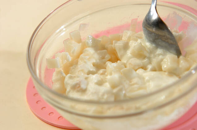 梨とプレーンヨーグルトを混ぜ合わせて器に盛り、ミントの葉を添える。お好みでハチミツをかける。