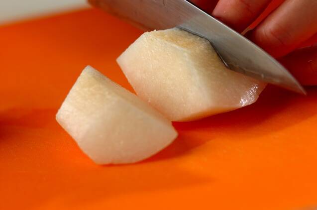 梨は皮をむいて種を取り除き、食べやすい大きさに切る。