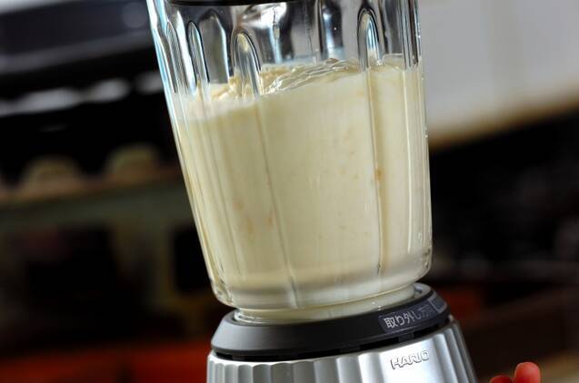 (1)の梨と全ての材料をミキサーに入れ、滑らかになるまでかくはんし、グラスに注ぐ。
