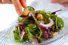 <ドレッシング>のボウルにルッコラ、ベビーリーフ、紫玉ネギを加え、軽く混ぜる。