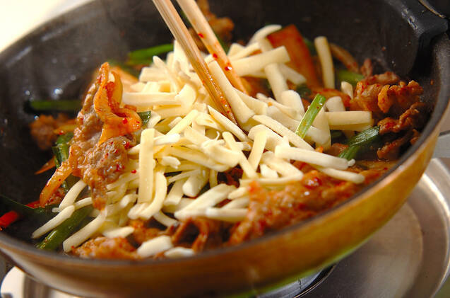 ニラを加えてサッと炒め合わせ、火を止める。ピザ用チーズを加えて混ぜ、蓋をして2分蒸らす。