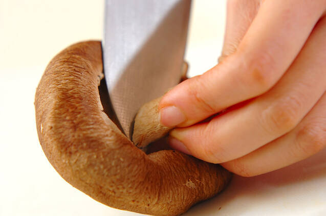 シイタケは軸を切り落とし、汚れを拭き取る。軸はみじん切りにして<タネ>に加える。