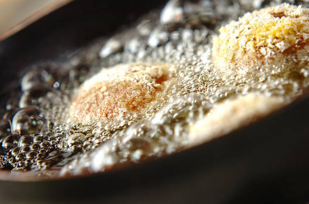 <衣>の溶き卵、パン粉を順につけ、170℃の揚げ油でサックリ揚げる。