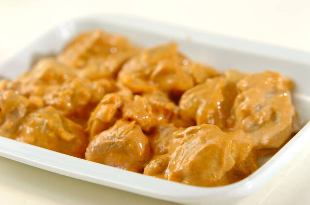 <タンドリーチキン>を作る。鶏もも肉はひとくち大に切り、塩、レモン汁をからめて10分位なじませ、混ぜ合わせた<下味>の材料に30分以上漬け込む。できれば半日くらいおくと味がしみ込んでおいしいです。