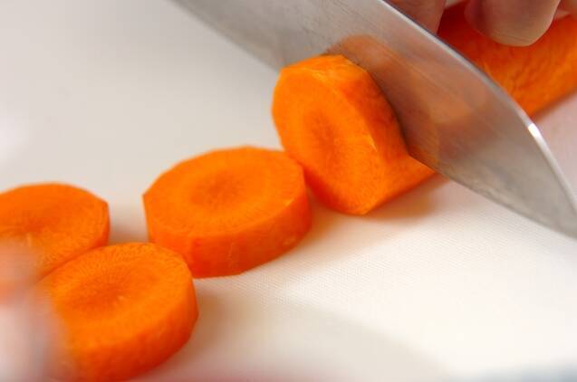 ニンジンはピーラーで皮をむき、厚さ1cmの輪切りにする。大きい部分は半月切りにする。