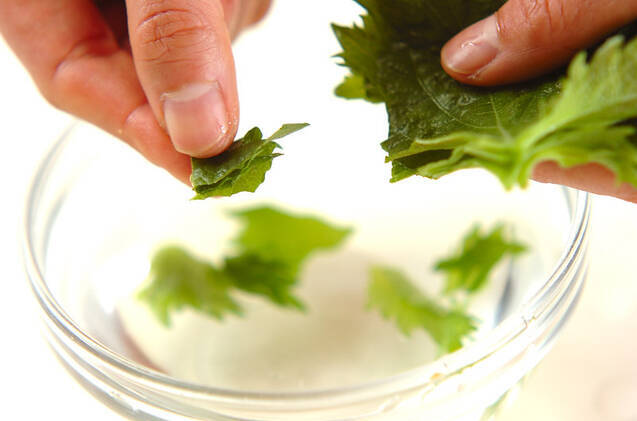 玉ネギは縦薄切りにする。牛肉が大きい場合は、食べやすい大きさに切る。水煮トマトがホールの場合は手でつぶしておく。大葉は軸を切り落とし、1cm角くらいにちぎって水に放ち、水気を絞る。
